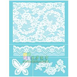 絹印型版, 圖案比一般型版細膩, 利用刮板上色(如圖3a), 較易將細膩處圖案表現出來. 或亦可使用海棉拍印((如圖3b), 實際尺寸: 21.5 X 28 cm, 共有1片(含4圖), 每份包裝均附作品應用參考, 圖案典雅, 並有一向Martha Stewart style 的蕾絲風格, 型版實用性很高, 可以運用在織品, 玻璃, 陶瓷, 木器, 紙品..等素材上作畫. 美國進口.