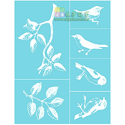 絹印型版, 圖案比一般型版細膩, 利用刮板上色(如圖3a), 較易將細膩處圖案表現出來. 或亦可使用海棉拍印((如圖3b), 實際尺寸: 21.5 X 28 cm, 共有1片(含6圖), 每份包裝均附作品應用參考, 圖案典雅, 並有一向Martha Stewart style 的蕾絲風格,  型版實用性很高, 可以運用在織品, 玻璃, 陶瓷, 木器, 紙品..等素材上作畫.  美國進口.