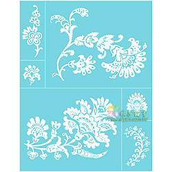 絹印型版, 圖案比一般型版細膩, 利用刮板上色(如圖3a), 較易將細膩處圖案表現出來. 或亦可使用海棉拍印((如圖3b), 實際尺寸: 21.5 X 28 cm, 共有1片(含6圖), 每份包裝均附作品應用參考, 圖案典雅, 並有一向Martha Stewart style 的蕾絲風格,  型版實用性很高, 可以運用在織品, 玻璃, 陶瓷, 木器, 紙品..等素材上作畫.  美國進口.