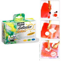 可直接使用, 不須再加水.先將布弄溼, 再使用海綿刷直接沾色, 染布刷色, 顏料未乾前, 立即將覆蓋物擺上, 再放在太陽光下完全晒乾約15-30分再將覆蓋物取下, 即可完成染印. 宜染淺色布棉質效果佳. 法國進口.