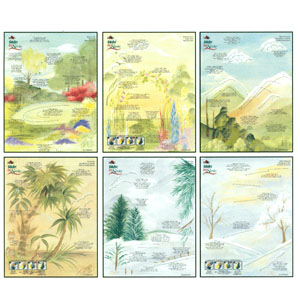 以各種不同的風景為彩繪重點,可直接於圖案上練習,重覆學習彩繪技巧及上色,畫完用濕布擦拭乾淨即可再重新練習.環保方便又好用.