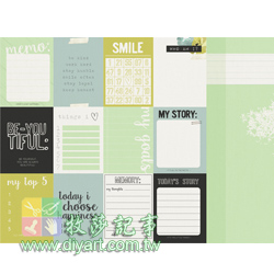 12" * 12", 雙面圖卡紙, 一張含多圖 (美好語句, 框..等), 可當成是一張已排版好的襯紙, 直接應用於相片美編黏貼