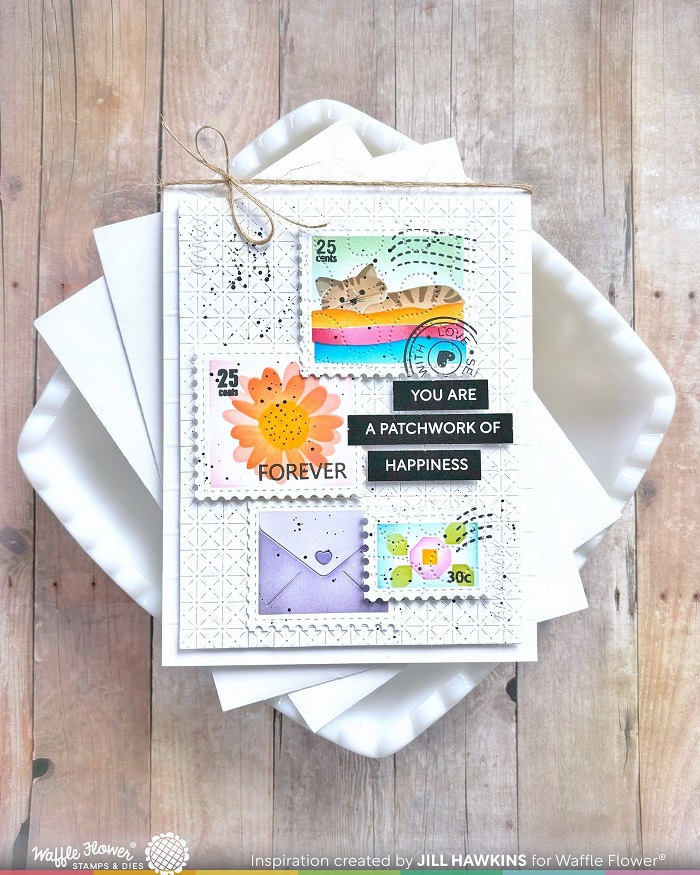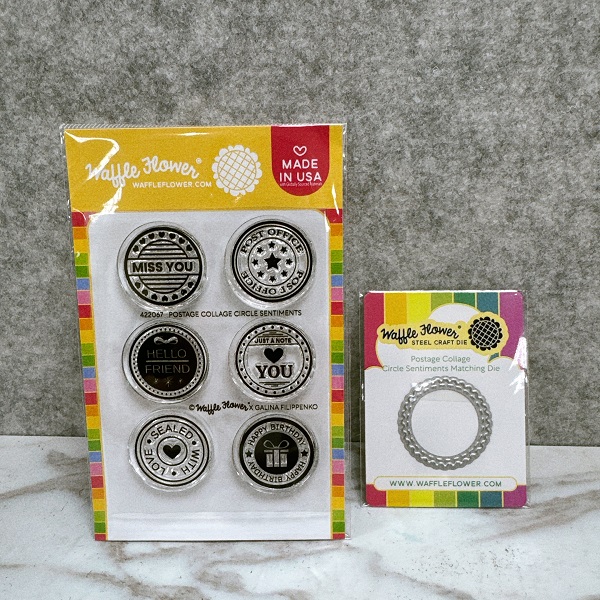 (2025) WAFFLE FLOWER 郵票(郵戳)透明印章+框刀模 - Postage Collage Circle Sentiments Stamp Set (網購優惠)